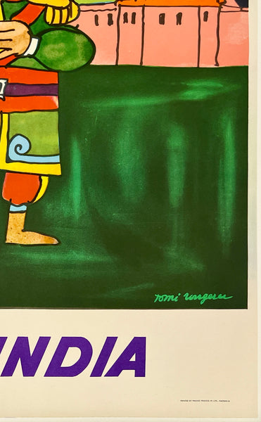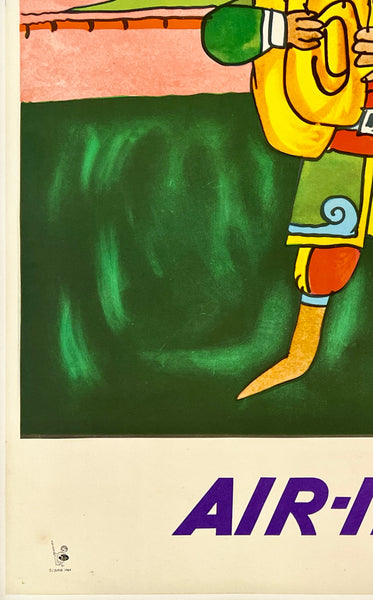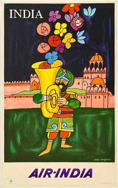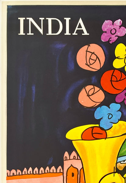 There is minor edge and corner wear and small tears; some light foxing spots in the bottom left corner area; this wonderful Air India poster should display beautifully once framed.