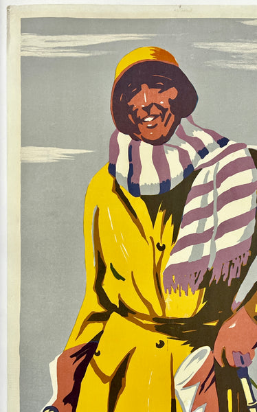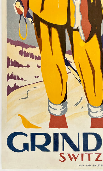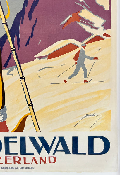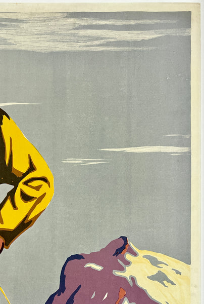 There is restored edge and corner wear, small tears, margin staining, tiny losses; some small areas of very well restored surface losses in image; some faint staining in bottom white area; overall this gorgeous Swiss travel poster is in rather nice condition and should display beautifully once framed.