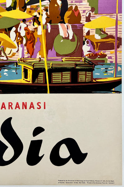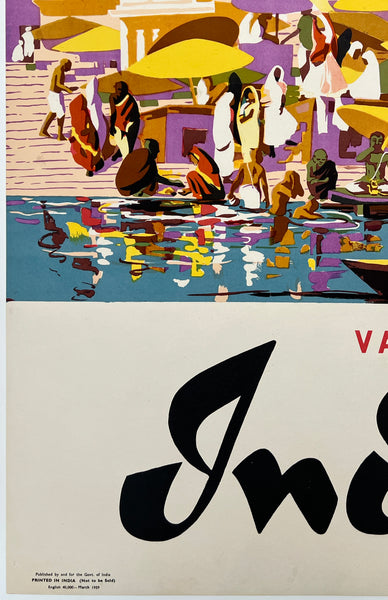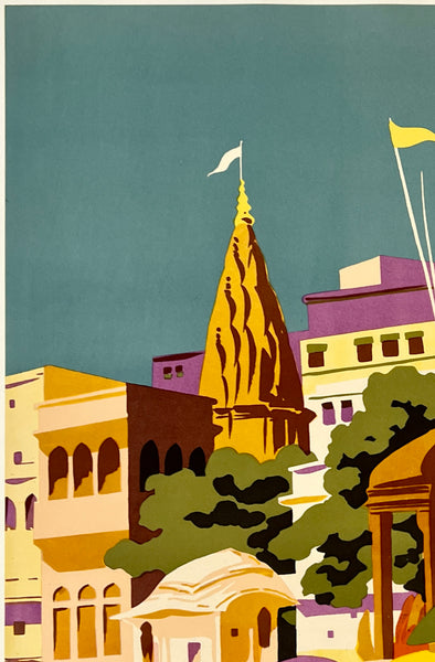 There is some minor edge and corner wear and creasing; some surface smudges/abrasions; some expert restoration to address surface paper loss between the red and white flags near the top of the poster; this gorgeous Indian travel poster should display very nicely once framed.