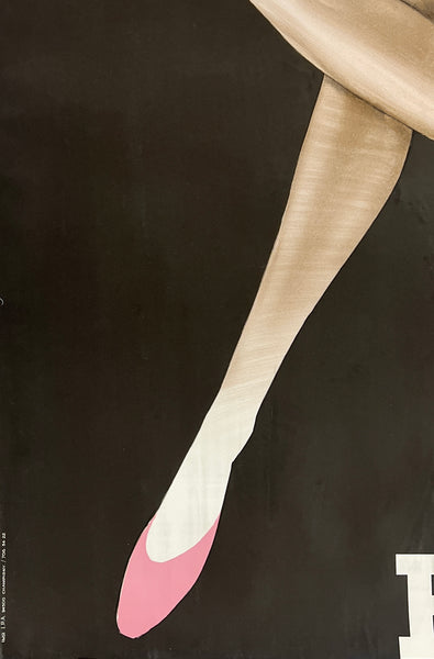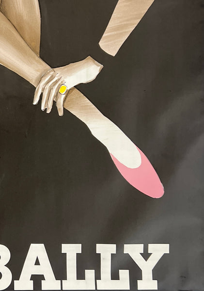 The linen has been trimmed to the margins and slightly into them in some places; along the left and ridge sides; some creases in image; some surface scratches/abrasions, most noticeable in and above the "B" of "BALLY" and just above the woman's knees; some waviness to the sheet; notwithstanding its defects, this great fashion advertising poster should display very nicely once framed.