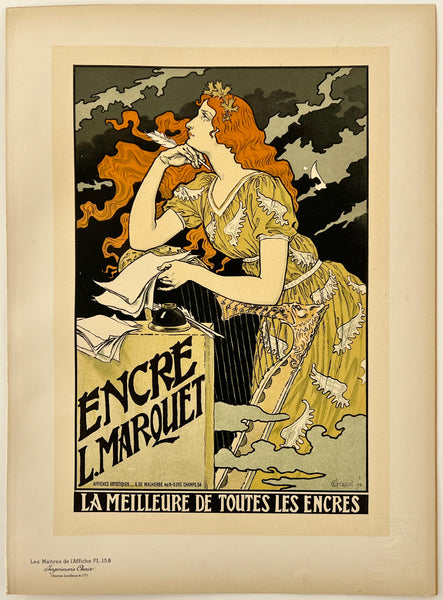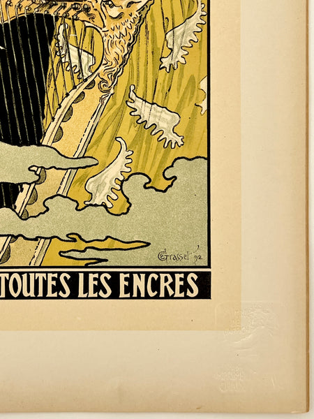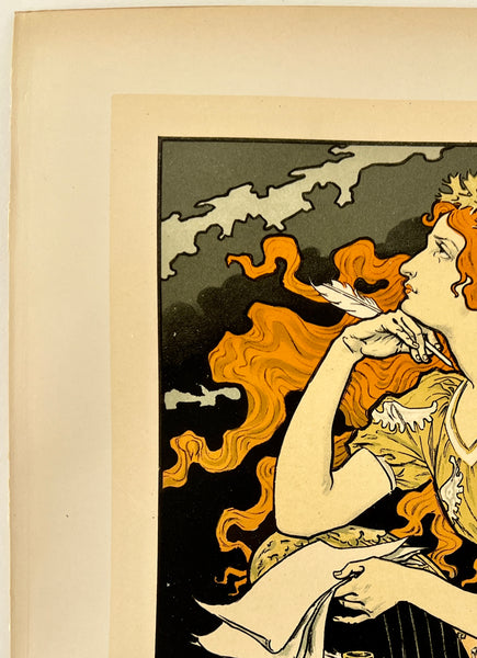 There is toning/time staining in the margins, most of which will be concealed by matting once the poster is framed; there are some smudges and accretions along the left edge where the plate was removed from its binding; there is a small scratch on the right side of the top edge of the margin just outside of the artwork; this fabulous art nouveau poster should display very nicely once framed.