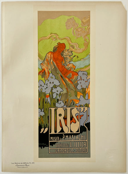There is some yellowing/toning consistent with age, most noticeable in the outer edge areas; there are some smudges and accretions along the left edge where the plate was removed from its binding; top right corner loss; this wonderful art nouveau poster should display beautifully once framed.