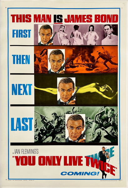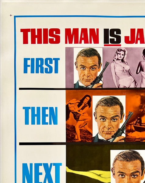 The poster was folded and restoration has been performed along the fold lines and cross folds to address fine surface paper loss; ink stamp printed by the movie company on the verso of the poster that slightly bleeds through to the front in the bottom right corner area; this fabulous 007 poster should display beautifully once framed.