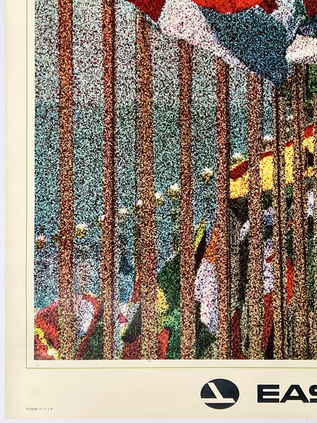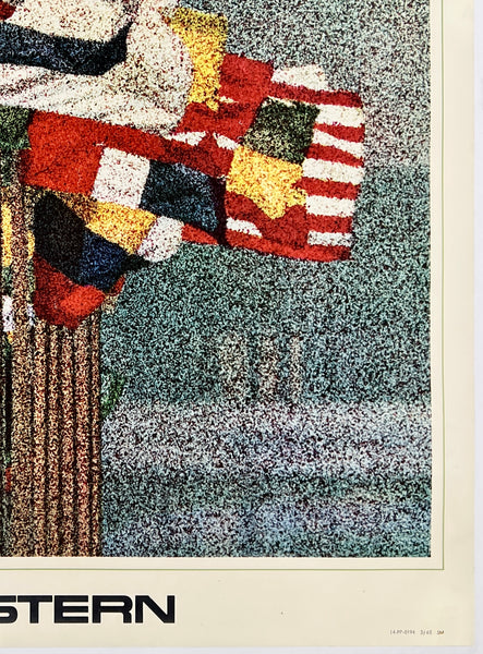 Extensive expert air brushing has been performed in the margins and upper and lower white areas to address edge and corner wear and paper loss; the area of artwork is clean and fresh; some surface scuffs/abrasions in the white areas; this very rare midcentury airline travel poster should display very nicely once framed.