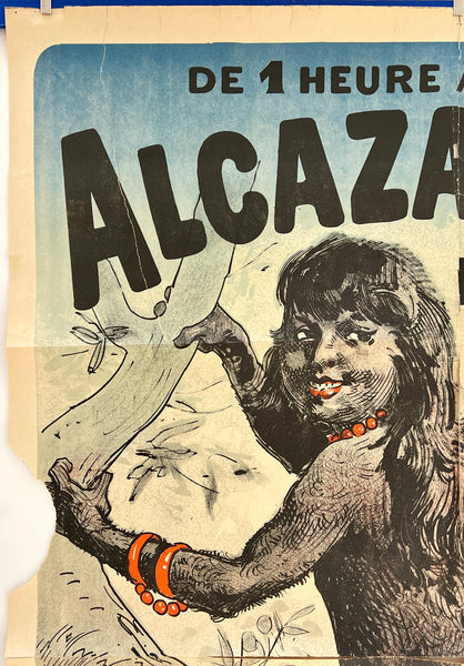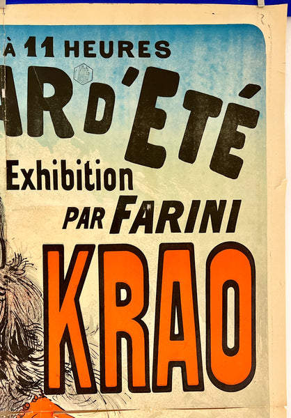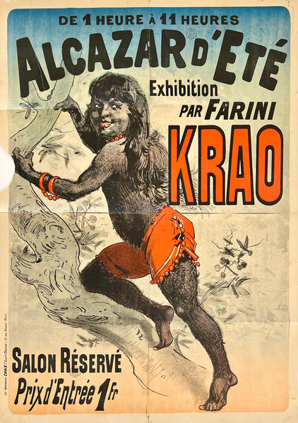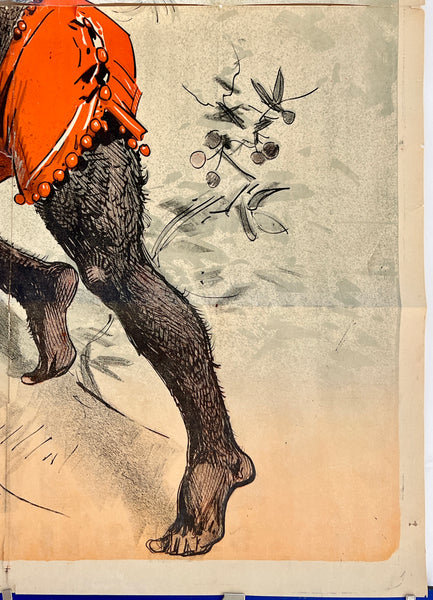The poster was folded once vertically and twice horizontally and there is separation along the fold lines as well as paper loss; some long tears up to to 13" in length; edge and corner wear, tears, and loss, including a large loss along the left edge by the woman's hand; ink tax stamp in the upper and lower text area; some paper loss in image; tape en verso for reinforcement; Dr. Sachs' identification stamp and numbers written in pencil on the verso; poster is in need of proper linen backing and restoration, which, once completed, will enable this very rare art nouveau poster to display nicely once framed.