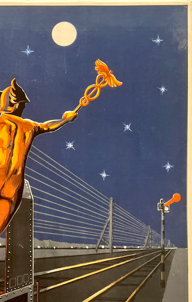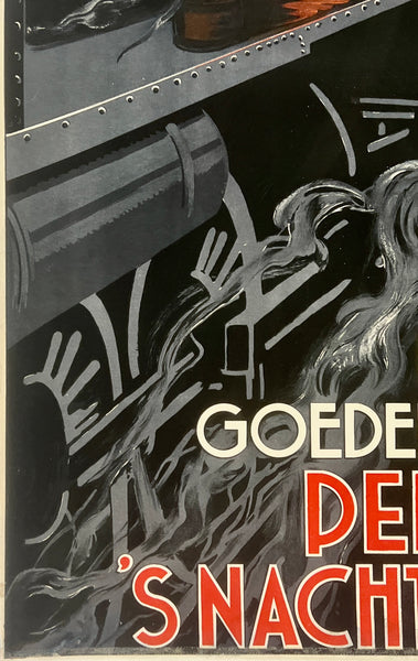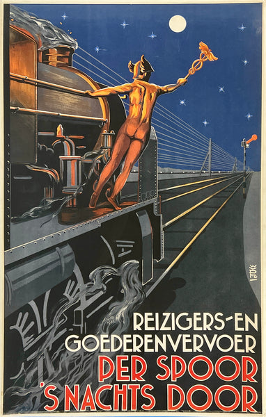 There is minor edge and corner wear and tiny tears; a small strip of old tape residue along the bottom edge of the poster; restoration has been performed in the upper right corner area; some horizontal creasing/cracking in the sky; this extremely rare and colorful Dutch railroad travel poster should display beautifully once framed.