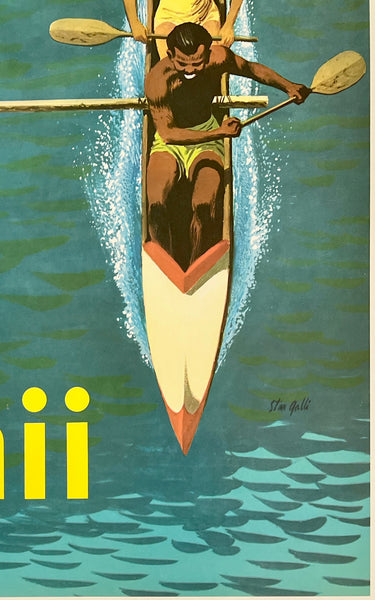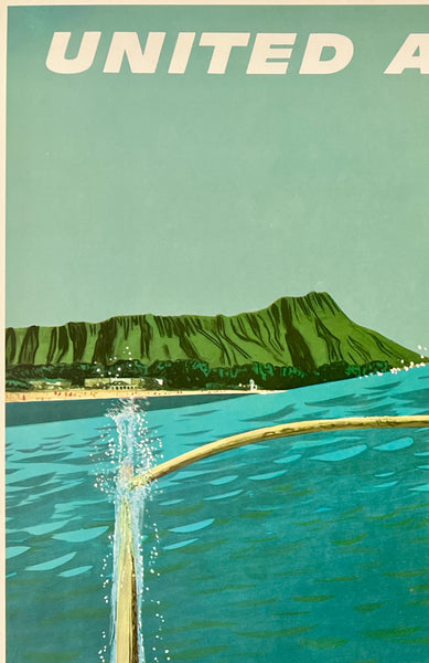 The top margin has been slightly trimmed by approximately .3"; there is some restored surface paper loss along the top edge and some creasing/cracking along the upper right edge; some very minor edge wear and tiny tears; this famous Hawaii travel poster should display very nicely once framed.