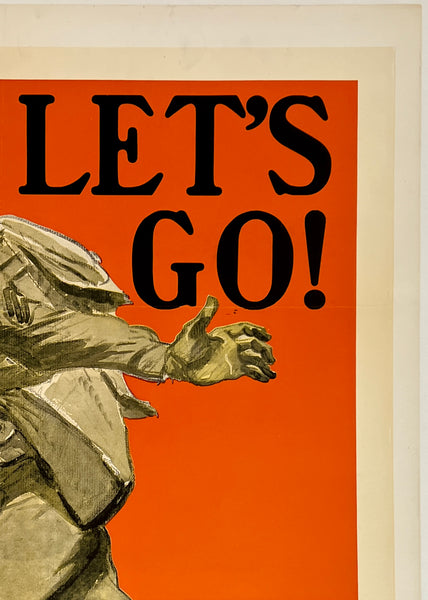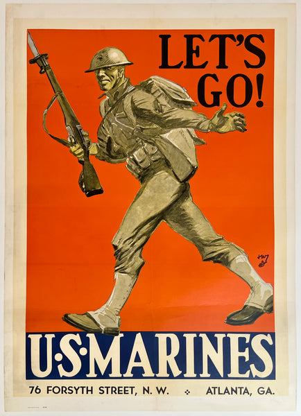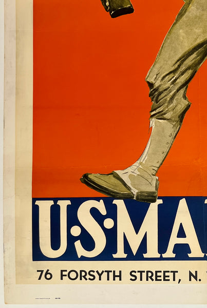 The poster was folded once vertically and twice horizontally and restoration has been performed to address surface paper loss along the fold lines and small losses at the cross folds; some surface smudges/soiling; horizontal bands of toning/darkening in and around the soldier's feet; despite its defects, this American WWII propaganda poster should display very nicely once framed.