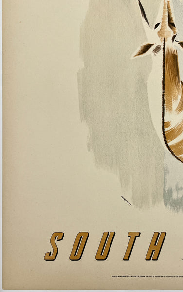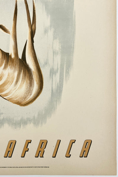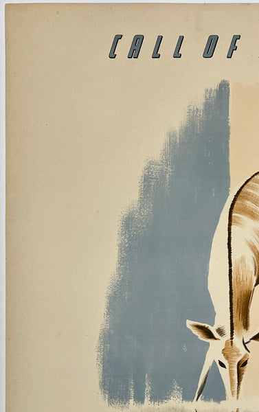 There is minor edge and corner wear and a 3" clean vertical tear at the top edge between the worlds "CALL" and "OF;" some paper yellowing/toning consistent with age; this fabulous South African travel poster should display beautifully once framed.