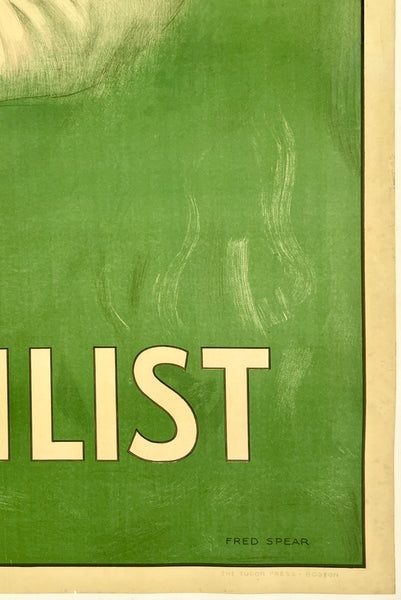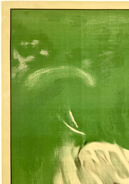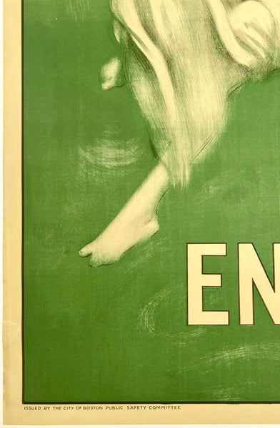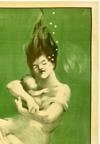 The poster was folded once vertically and horizontally; there is restored edge and corner wear, tears, creasing, small losses; expertly area of restored loss along the right edge near the middle of the poster slightly entering the green of the image; some surface scuffs/abrasions; this powerful WWI propaganda poster of a mother and child descending to the bottom of the sea following the sinking of the Lusitania should display beautifully once framed.