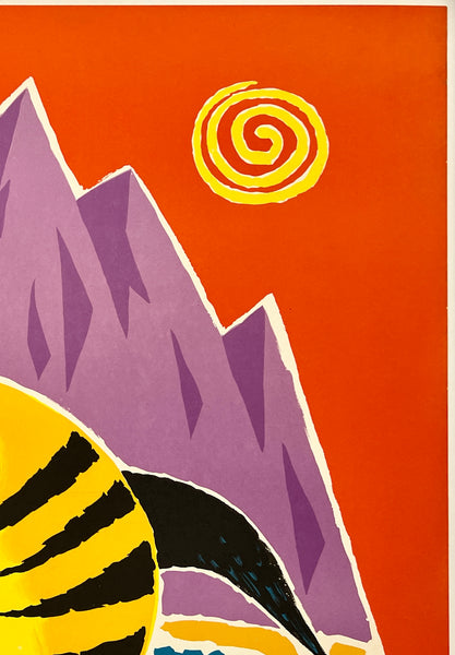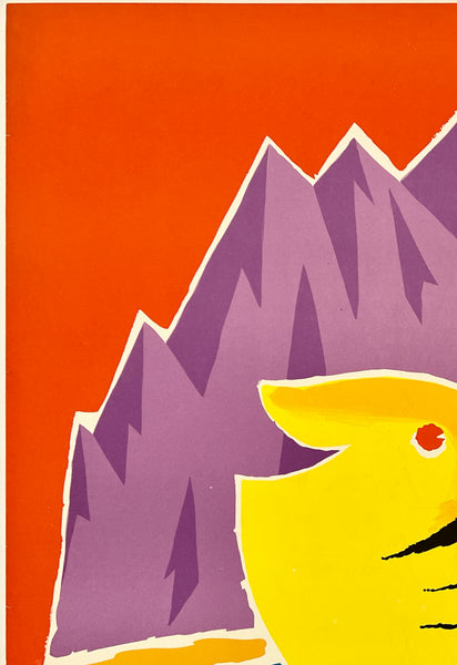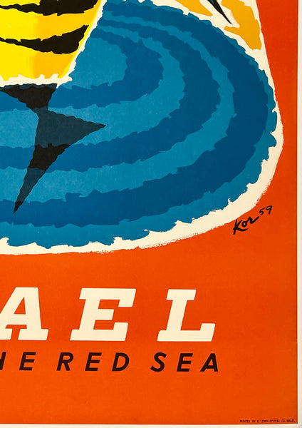 This fun and colorful Israel travel poster is in near mint condition with just some tiny edge tears and vertical creasing below the word "EILAT;" it should display beautifully once framed.