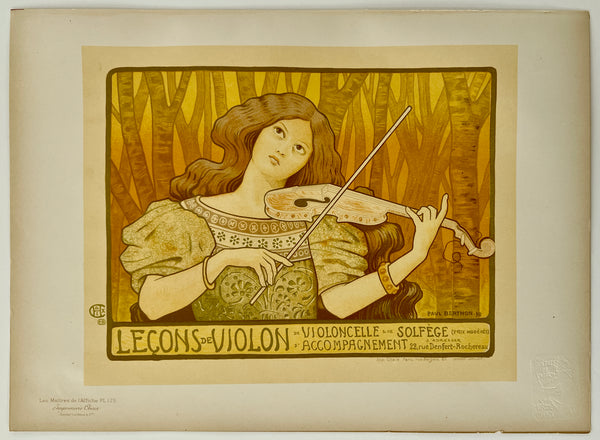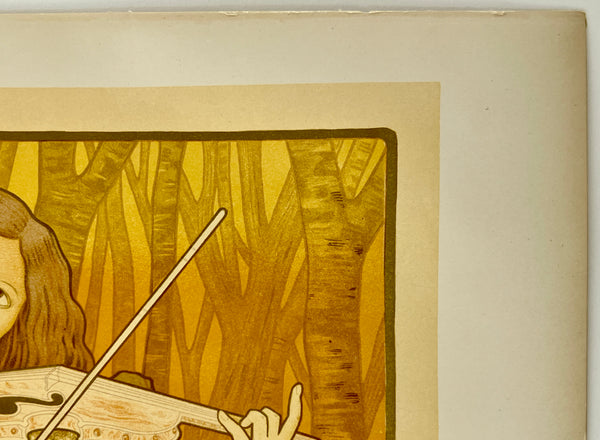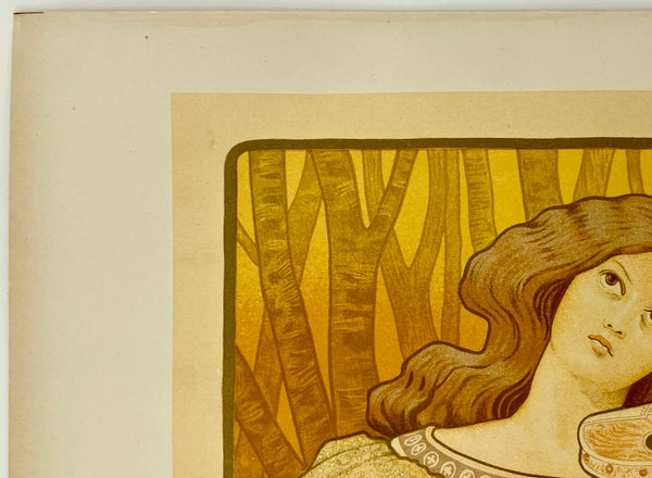 There is some yellowing/toning consistent with age, most noticeable in the outer edge areas; there are some smudges and accretions along the left edge where the plate was removed from its binding; some wear and toning along the bottom edge; this gorgeous art nouveau poster should display beautifully once framed.