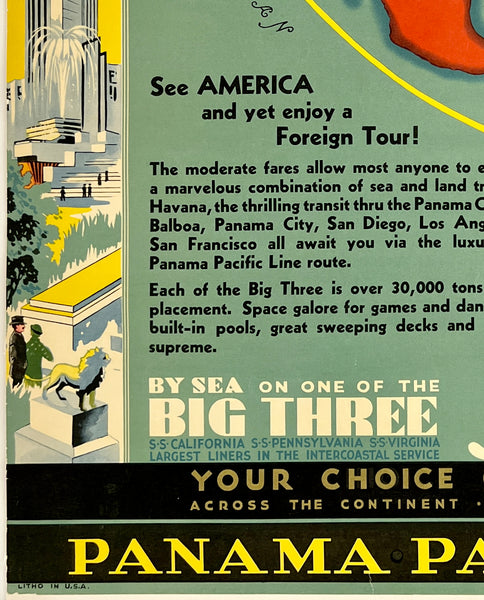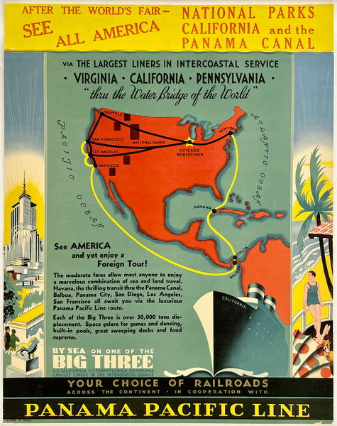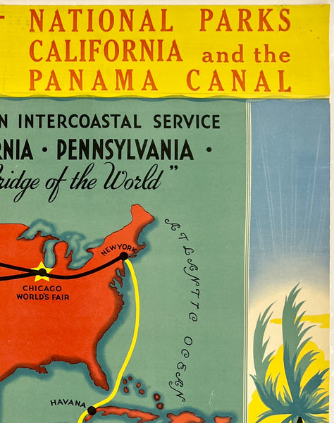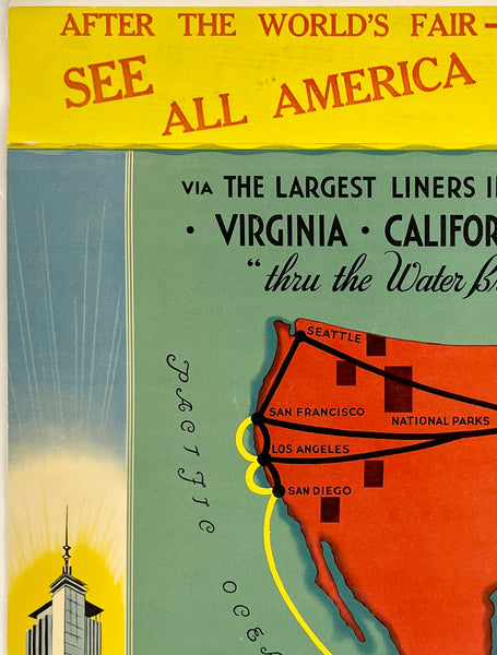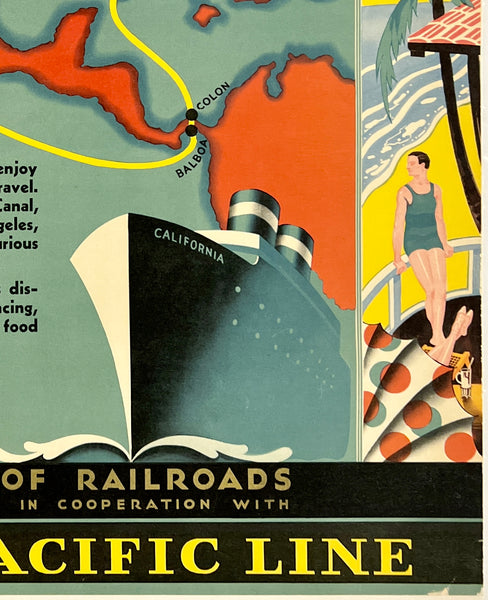 The upper yellow box with text is a snipe that was adhered to the poster post-printing; there is minor edge and corner wear, most noticeable at the bottom right corner; small round stain spot in the middle of the bottom text; some staining in the top yellow box and text area; some surface scuffs/abrasions; this extremely rare ocean liner/railroad travel poster should display very nicely once framed.