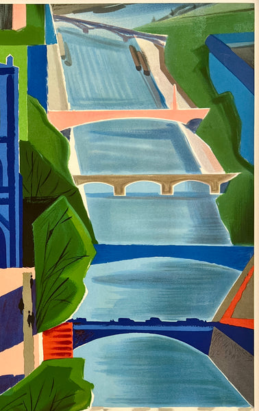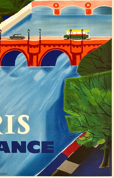 There are areas of expertly restored surface paper loss from tape removal on the top edges near the corners, along the top right edge near the top right corner, in the bottom left corner area, and near the left edge about a third of the way down the poster; otherwise, this gorgeous poster with bright colors is in near mint condition and should display beautifully once framed.