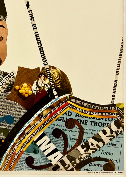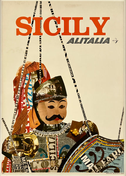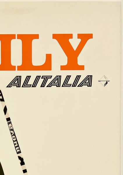 There is minor edge and corner wear, creasing, scattered small tears; some faint staining above the upper text and near the top edge as well as in the white area a few inches below the text "SICILY;" some abrasions and smudges in and around the text "ALITALIA;" this fun airline travel poster should display very nicely once framed.